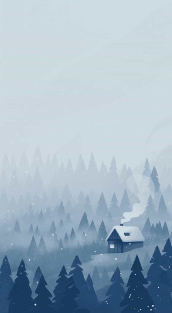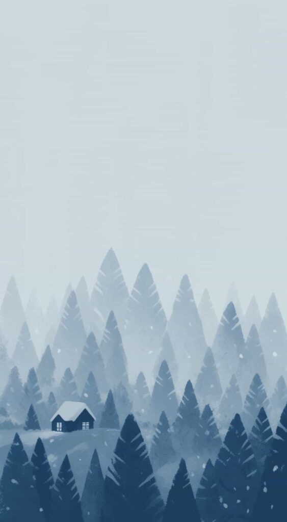 A peaceful scene of trees and a little cabin gives off quiet holiday vibes. Itโs perfect if you want something that feels like a winter getaway.