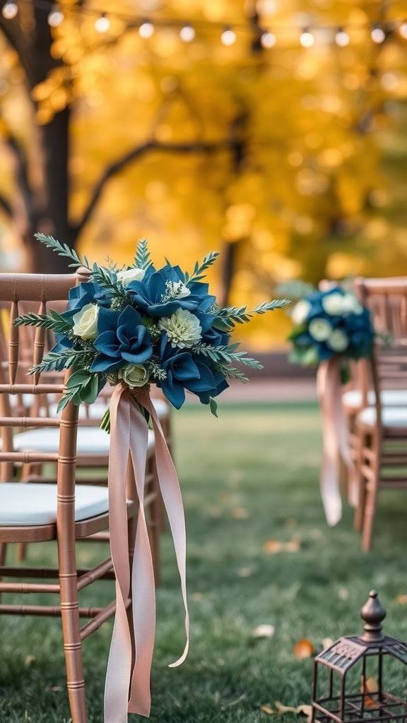 Picture a beautiful fall wedding with aisle markers that perfectly blend dusty pink and navy blue. These colors create a warm and inviting atmosphere, making the ceremony feel special. The navy florals add a touch of elegance, while the dusty pink ribbons bring a soft, romantic vibe.