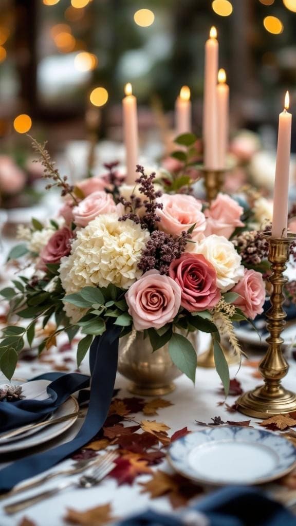 Picture a beautiful fall wedding where dusty pink roses and navy blue ribbons create a stunning centerpiece. This combination brings a warm and inviting feel to any table. The soft hues of the roses contrast beautifully with the deep navy, making each arrangement pop.