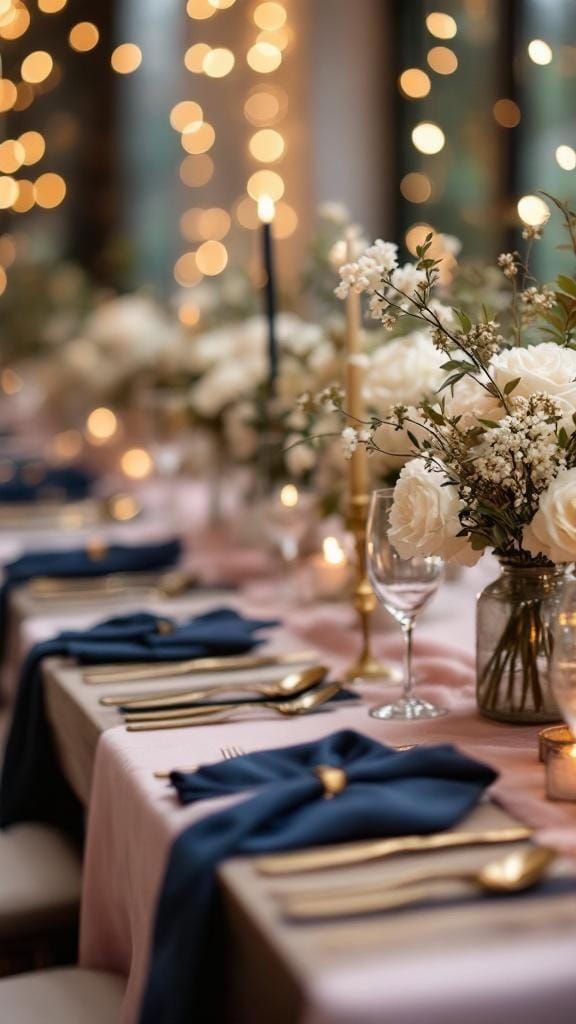 If you’re looking to DIY this decor, start by choosing a dusty pink fabric for your table runner. You can easily find fabric at craft stores or online. Cut it to the desired length, ensuring it drapes nicely over the table. For the navy napkins, consider using cloth napkins for a more upscale feel. Fold them neatly and place them beside each plate.