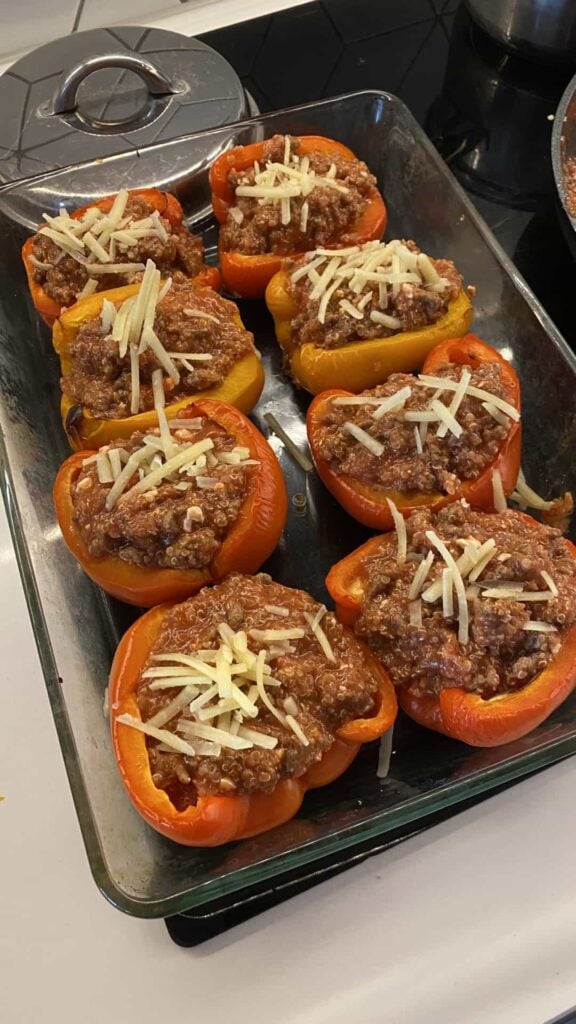Remove your roasted peppers from the oven. Spoon the beef and quinoa filling into each pepper half, packing it in well. Top each one with shredded cheese.