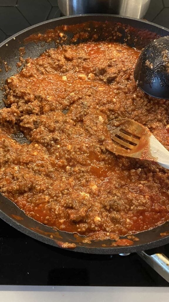 Once the beef is cooked, lower the heat and add in the cooked quinoa and your tomato sauce or peeled tomatoes. If using whole tomatoes, break them up with a spoon as they simmer.