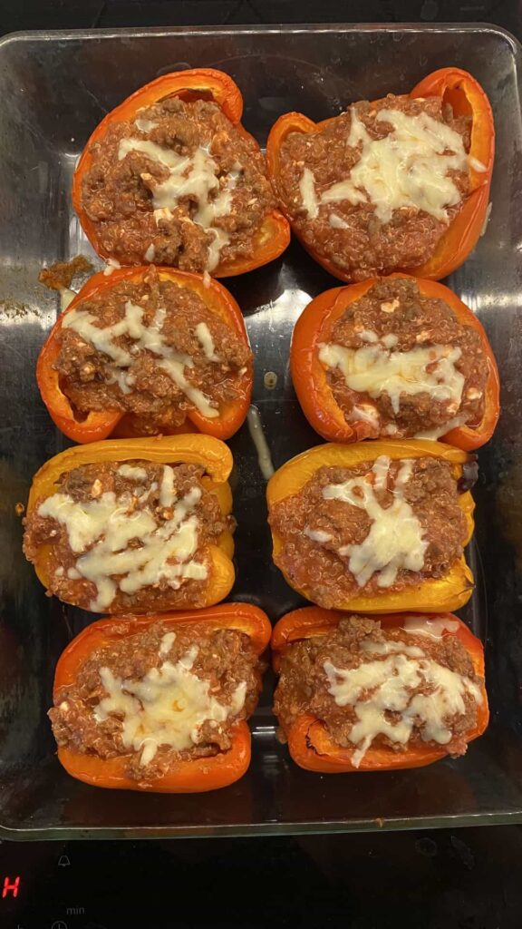 You can also freeze them after baking. Let them cool completely, wrap each pepper half in foil or store in a freezer-safe container. To reheat from frozen, bake at 180ยฐC (350ยฐF) for about 25โ30 minutes, or until hot throughout.