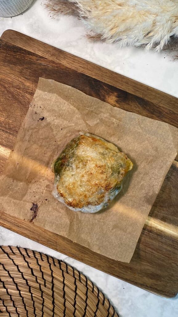 What I love about this recipe is how the rice paper crisps up in the oven after baking, while the inside stays soft and juicy. It’s kind of like a handheld quesadilla, but without the tortilla. The extra mini rice paper sheet on top helps seal everything in before wrapping, which makes it way easier to handle (and eat without a mess).