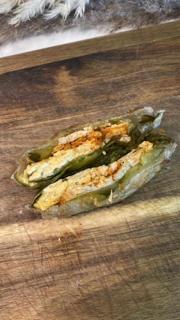 If you’ve never made a sandwich with rice paper, this is your sign to try it. It’s warm, crispy, and packed with flavor—and honestly, it holds together better than most wraps. This rice paper sandwich is layered with scrambled eggs, chicken, pickles, and a little heat from jalapeño and sriracha. It’s comforting but still light, and you don’t even need a pan—just pop it in the oven and you’re good to go.