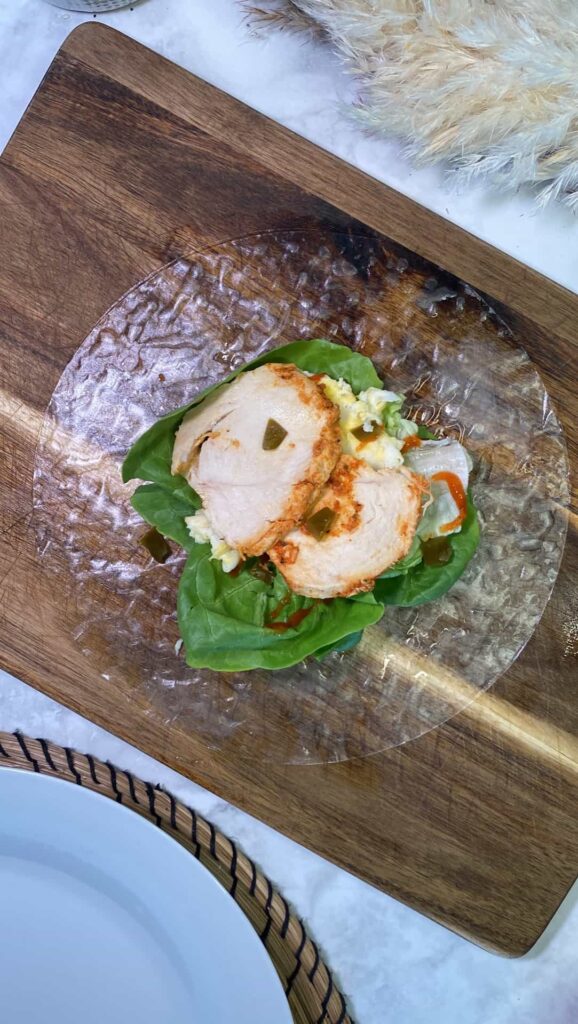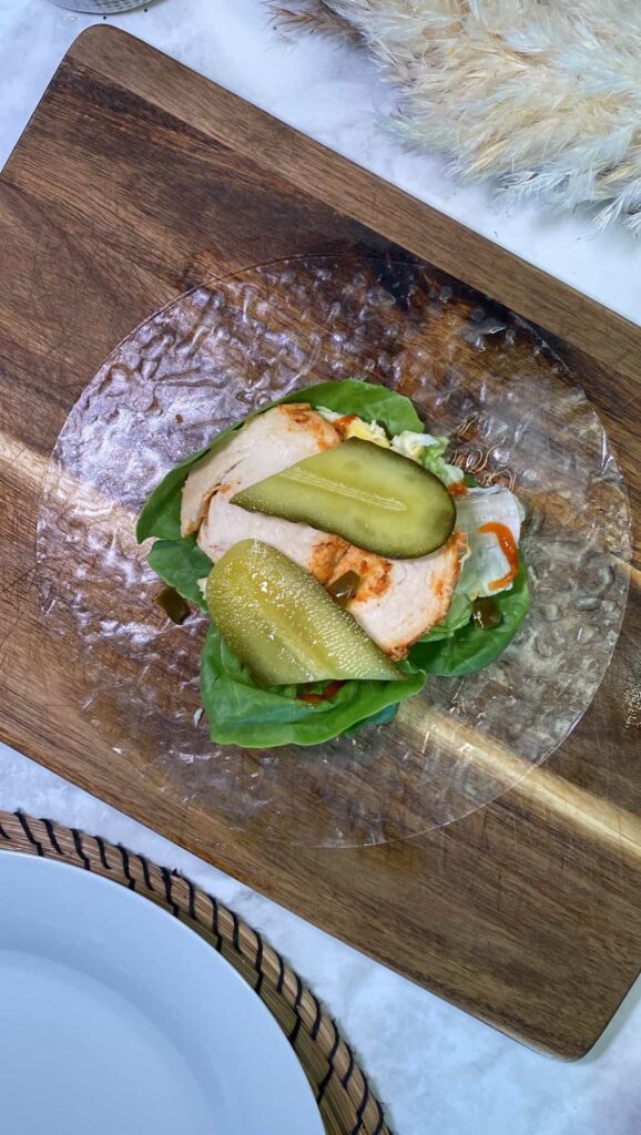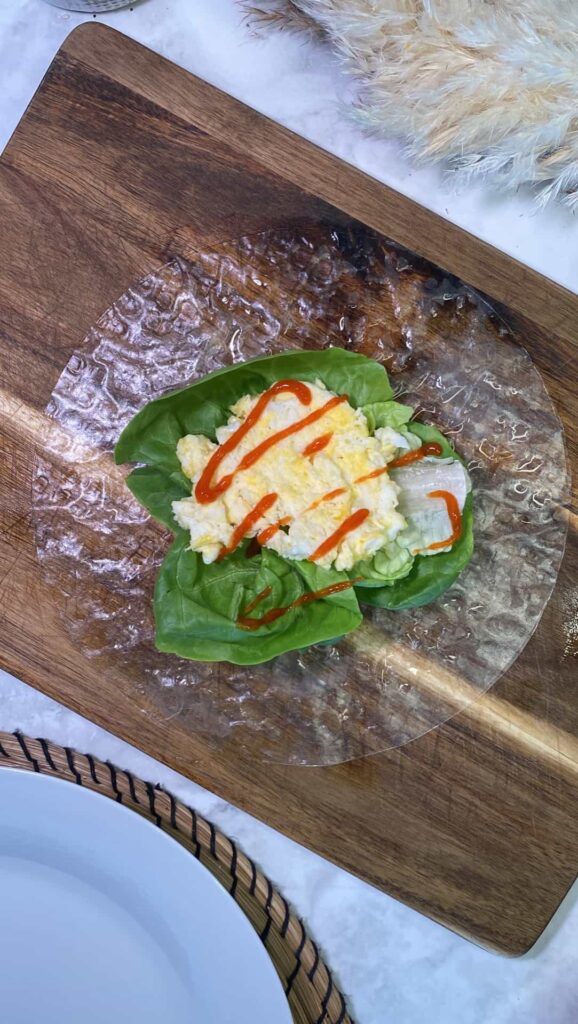Start layering directly on the rice paper base. Add lettuce first, then pile on the scrambled eggs. Drizzle with sriracha. Add your pickles, chopped jalapeño, and sliced chicken over the top.
