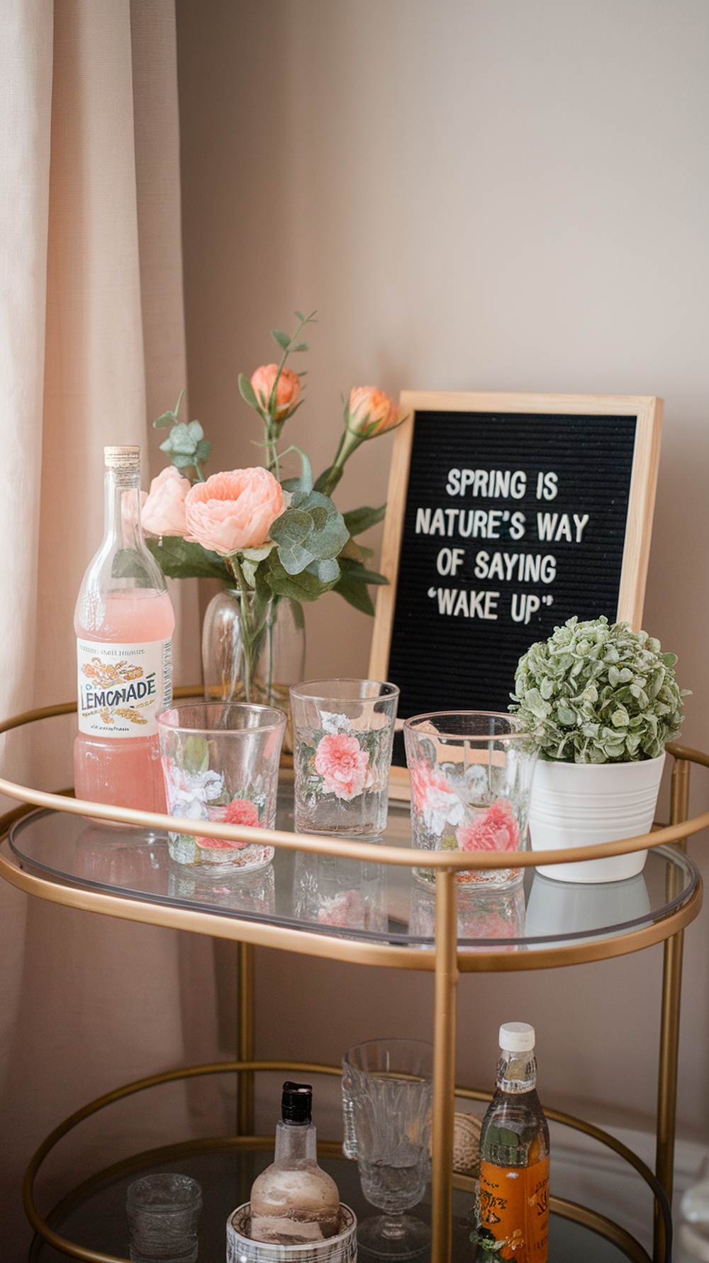 Setting up a spring bar cart can be a fun way to celebrate the season. The image shows a lovely bar cart adorned with fresh flowers and refreshing drinks. The pink lemonade adds a cheerful touch, perfect for spring gatherings.