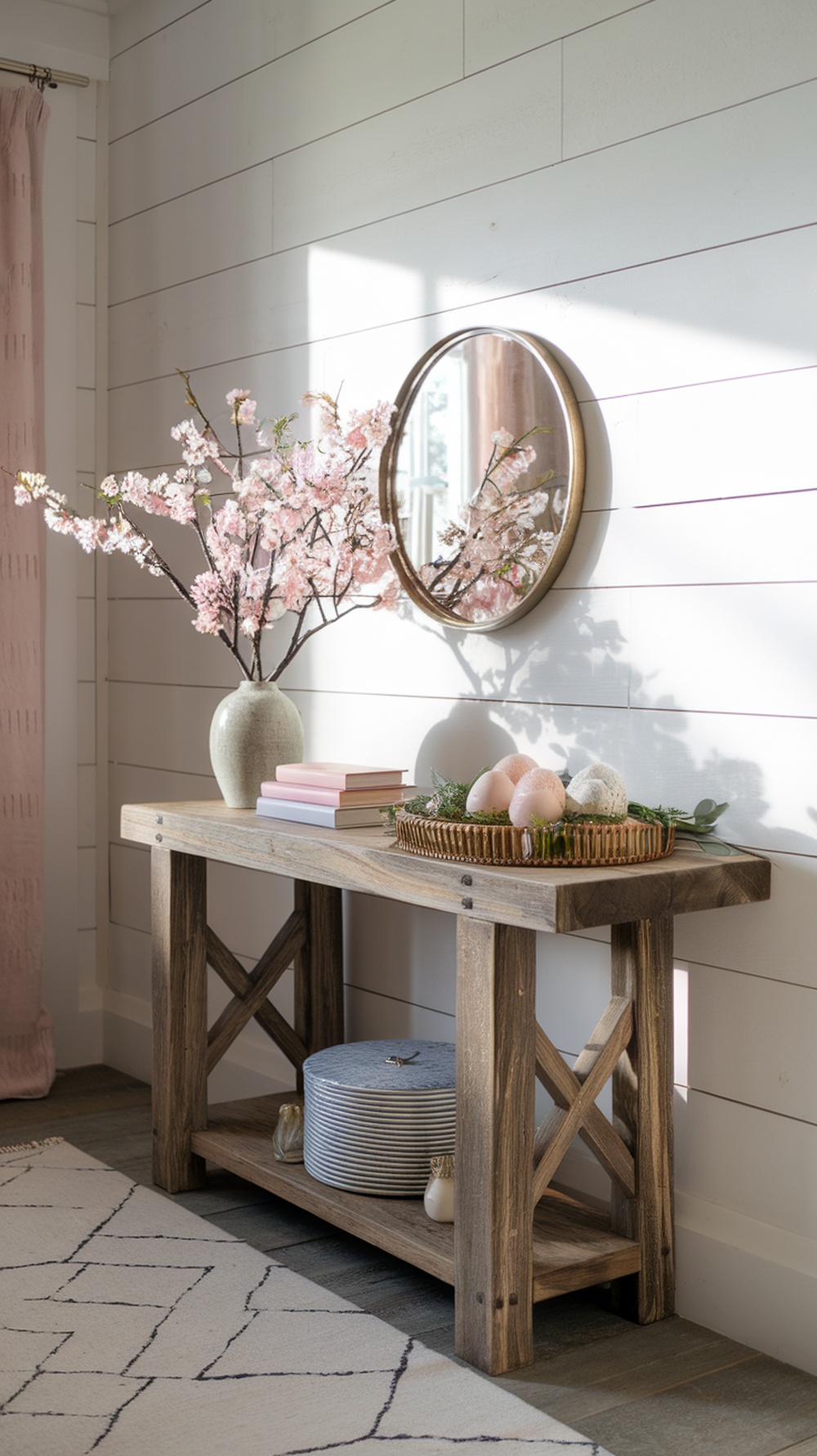 The mirror above the console reflects light and creates a sense of depth. Mirrors are fantastic for making spaces feel larger and brighter, especially in spring when natural light is abundant.