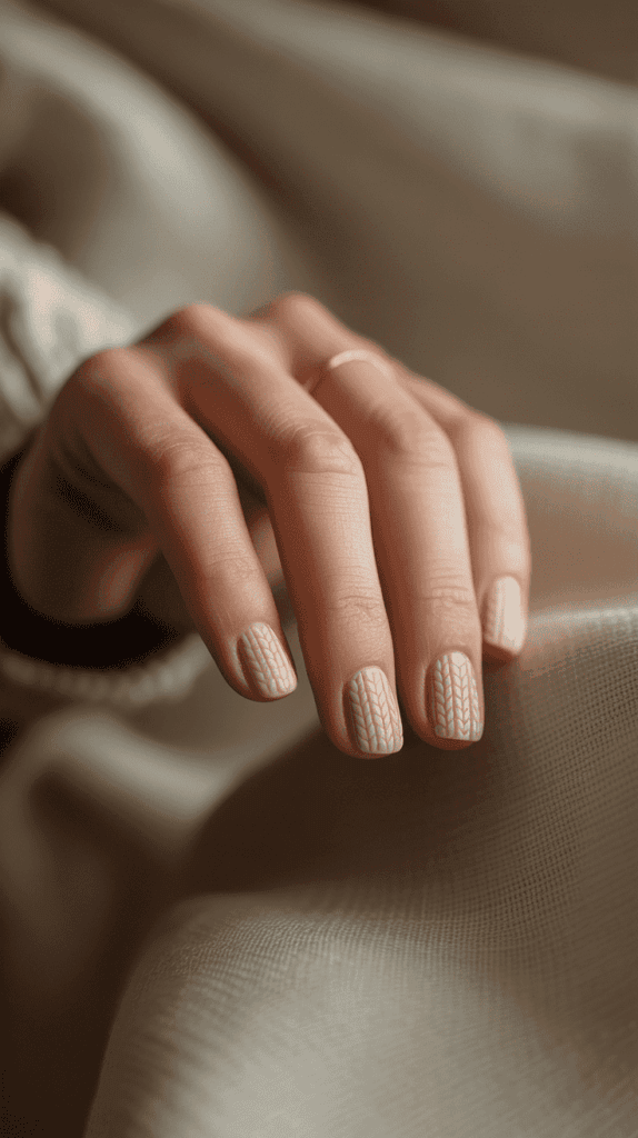 A hand with burgundy nails featuring leaf outlines, wearing a cozy tan sweater.