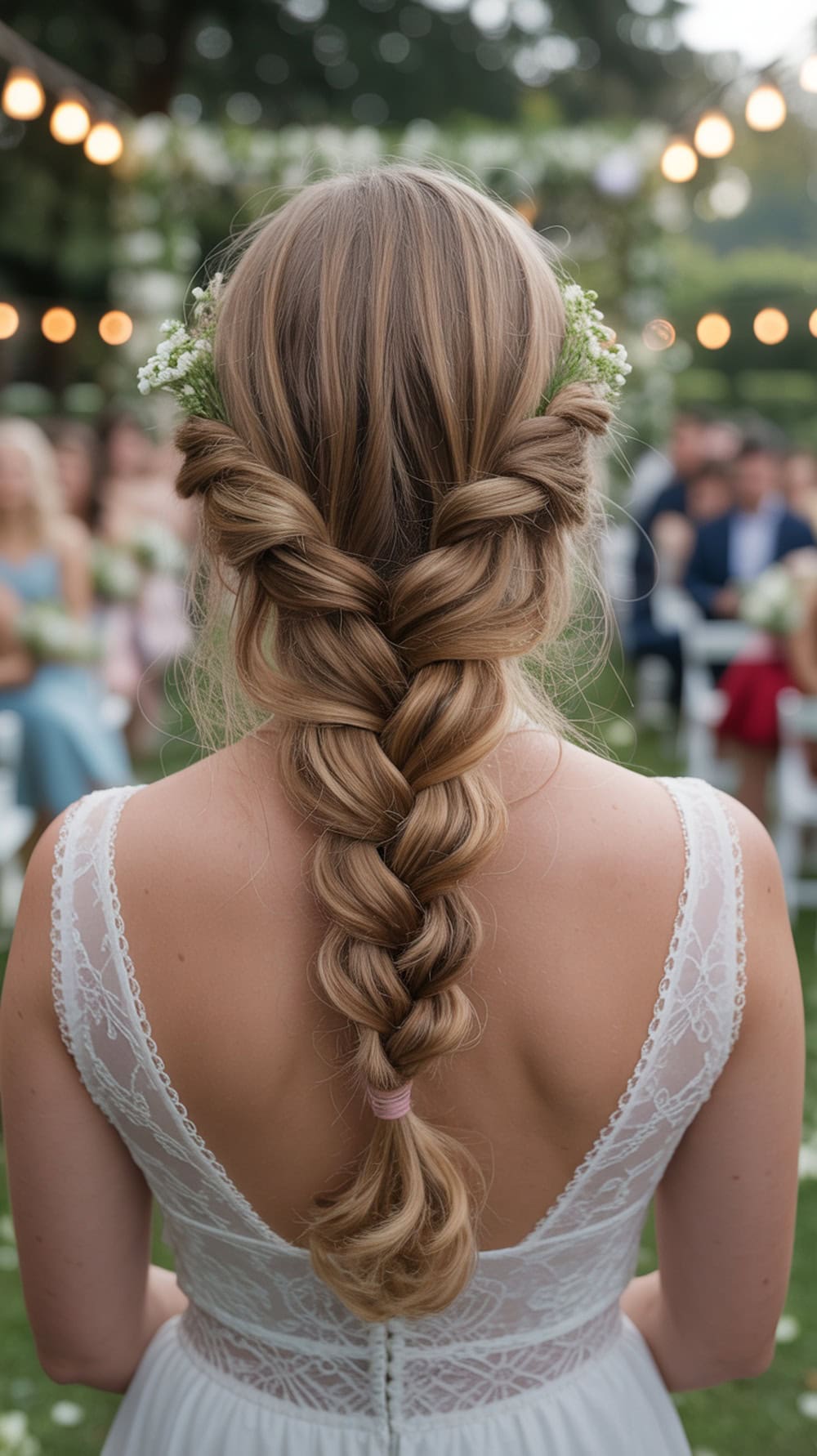 As the braid reaches the nape of the neck, it transitions into a low twisted bun. This bun is soft and slightly undone, creating a relaxed vibe perfect for a wedding. The addition of delicate flowers peeking out adds a romantic touch, making it ideal for outdoor ceremonies.
